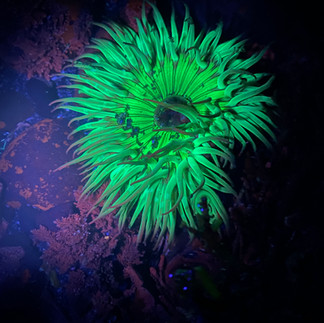 Animals flourescing under UV light, left to right: Yellow-spotted Millipede (Harpaphe haydeniana), Sunburst Anemone (Anthopleura sola), and Smeringurus vachoni